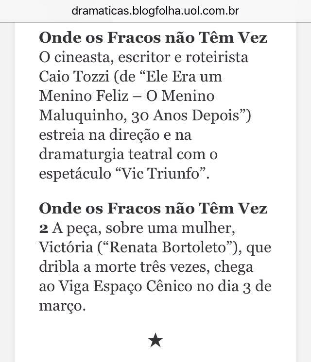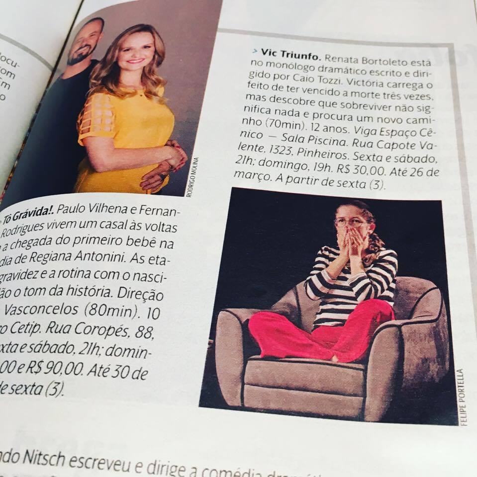 O monólogo “Vic Triunfo”, escrito e dirigido por Caio Tozzi, conta a história de Victória, uma mulher que venceu a morte três vezes, mas que descobre que sobreviver não significa nada e busca um novo caminho para entender sua vida.
